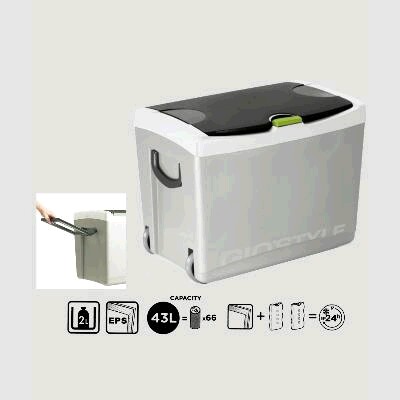 frigorifero passivo con coperchio incernierato per una facile apertura con sistema di bloccaggio – con ruote e manico estraibile per un facile trasporto – isolamento in polistirene espanso alta densità – sistema di bloccaggio del coperchio chiuso – possibilità di posizionamento verticale con due griglie interne come ripiani – interno del coperchio predisposto per alloggiamento di n.2 mattonelle da 400gr di ghiaccio GiòStyle – 24h di autonomia ad una temperatura compresa tra 5 e 15°C – accessori inclusi: n.2 ghiacci, n.2 griglie – dimensioni: cm.58×38,5×44,5 – peso kg.6,04