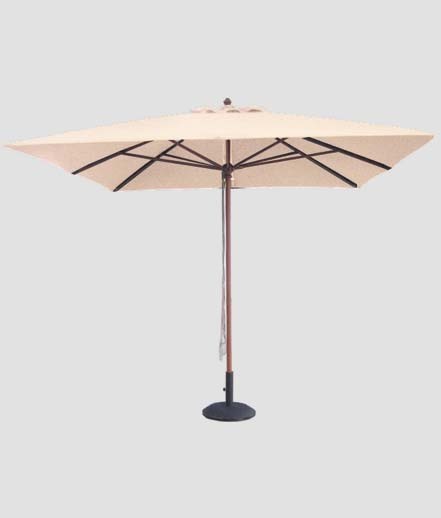 telo poliestere 245 gr/mq, colore ecrù – antivento – palo Ø 48 – 8 stecche – palo e stecche in legno esotico – finiture color ottone – senza base